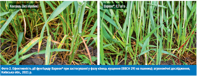 Вочевидь, що для перших весняних обробок потрібен фунгіцид, який може ефективно контролювати комплекс ранньовесняних хвороб, бути дієвим за низьких температур і мати тривалий період захисту. З огляду на ці вимоги ми радимо комплексний фунгіцид Вареон®, котрий зарекомендував себе як надійний засіб проти хвороб зернових колосових саме рано навесні (фото 2).