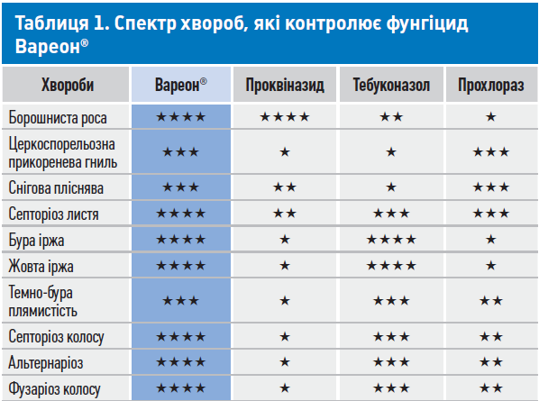 Вареон® містить три діючі речовини: проквіназид, тебуконазол та прохлораз, які в комплексі забезпечують високу ефективність проти певного спектра хвороб (табл. 1). Фунгіцид Вареон® є ідеальним рішенням для застосування навесні, після відновлення вегетації озимих зернових культур. Виробники, що мали досвід використання цього препарату, відзначають його позитивний вплив на фізіологію рослин: пришвидшення розвитку кореневої системи, збільшення кількості продуктивних стебел, інтенсивний ріст. Рекомендована норма застосування – 0,75 л/га.