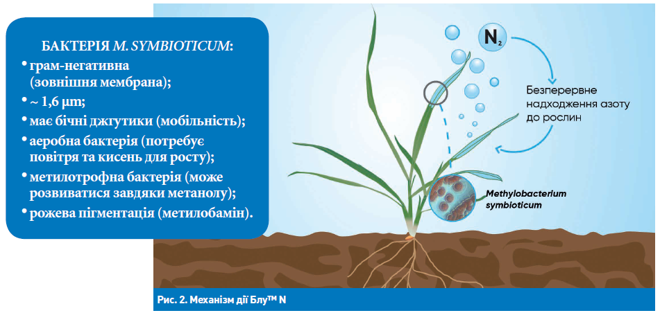 Великий резерв азоту міститься в атмосфері у молекулярному вигляді (як N2), що становить близько 78% об’єму повітря, втім, він недоступний для рослин. Компанія Corteva вивела на ринок новий інноваційний біологічний продукт Блу™ N, що містить ексклюзивні ендофітні бактерії Methylobacterium symbioticum, які забезпечують рослину азотом у природних умовах, тобто сприяють фіксації азоту з повітря. Блу™ N потрапляє в рослину через листя: бактерії швидко колонізують поверхню рослин, перетворюючи листя на середовище свого існування (рис. 2). Блу™ N – оптимізатор живлення рослин, що ефективно забезпечує рослини азотом упродовж усього періоду вегетації, підвищуючи їхню продуктивність.