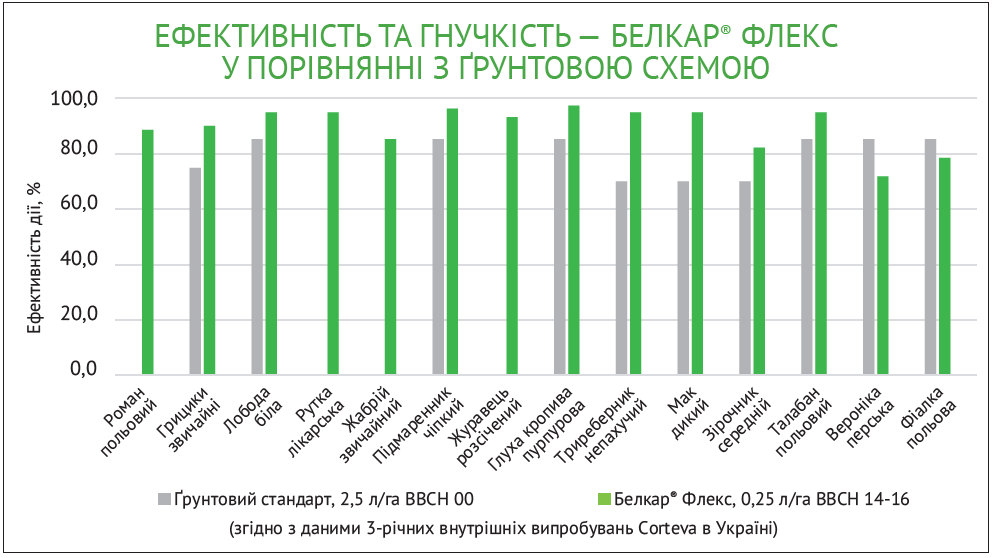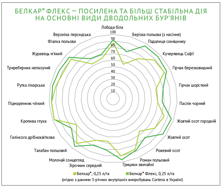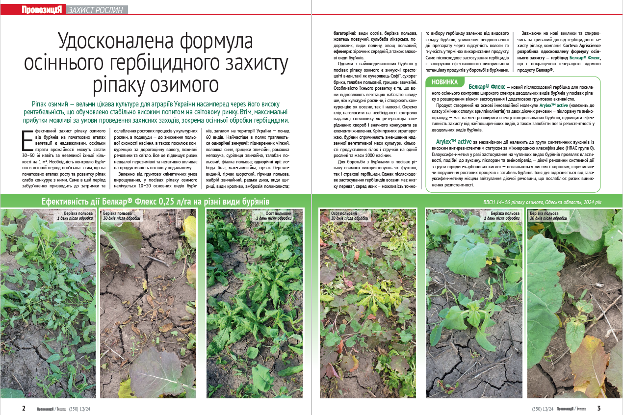 Зважаючи на нові виклики та послуговуючись досвідом у гербіцидному захисті ріпаку, компанія Corteva Agriscience розробила вдосконалену формулу осіннього захисту – Белкар® Флекс, що є покращеною генерацією відомого продукту Белкар®.