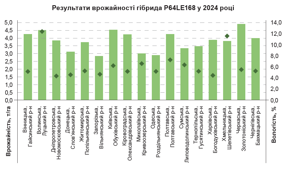 P64LE168 – середньоранній гібрид для технології ExpressSun®, добре адаптований до різних умов вирощування, має високий рівень посухостійкості, захищений від вовчка двома стійкостями (Or7 + горизонтальна – System II). Підходить для використання на всій території України, найкраще здатен переносити мінливі умови в центральних регіонах. Гарний рівень толерантності до листостеблових хвороб допомагає йому зберігати врожай, хоча в теперішніх умовах ефективне виробництво соняшнику без фунгіцидного захисту неможливе.