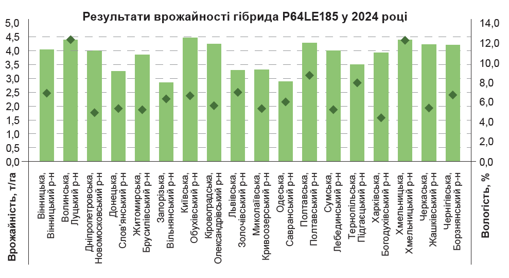 P64LE185 – потужний середньоранній гібрид для технології ExpressSun® з найкращими показниками олійності у своєму сегменті. Високий рівень посухостійкості, максимальний генетичний захист від вовчка, гарна автофертильність (здатність самозапилюватись) роблять цей гібрид ідеальним для вирощування на сході та півдні країни. Але при цьому він годиться для використання у всіх областях. Дуже гарно реагує на інтенсивну технологію, показуючи врожайність, вищу за 5 тонн.