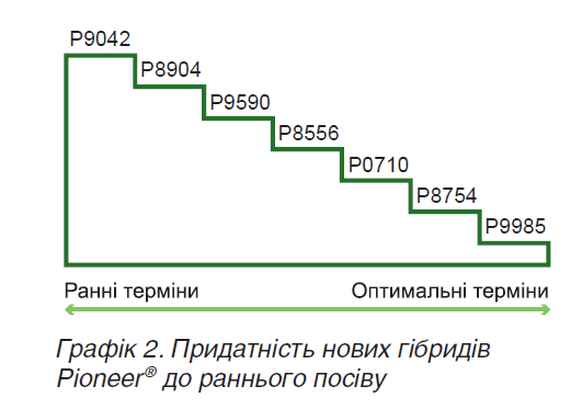 Придатність нових гібридів Pioneer® до строків сівби показано на графіку 2. Графік показує, що адаптивні гібриди та гібриди із кременистим типом зерна (Р9042, Р9590, Р8556) годяться для раннього посіву, в той час як інтенсивні гібриди лінійки Optimum® AQUAmax® (Р0710, Р8754, Р9985) рекомендовані для посіву в оптимальні терміни. Винятком є Р8904, який теж належить до лінійки Optimum® AQUAmax®, але має добру стресостійкість і потужний стартовий розвиток, що дає змогу виходити з ним в поле ще до оптимальних термінів, коли температура на глибині посіву менша за 10°C.