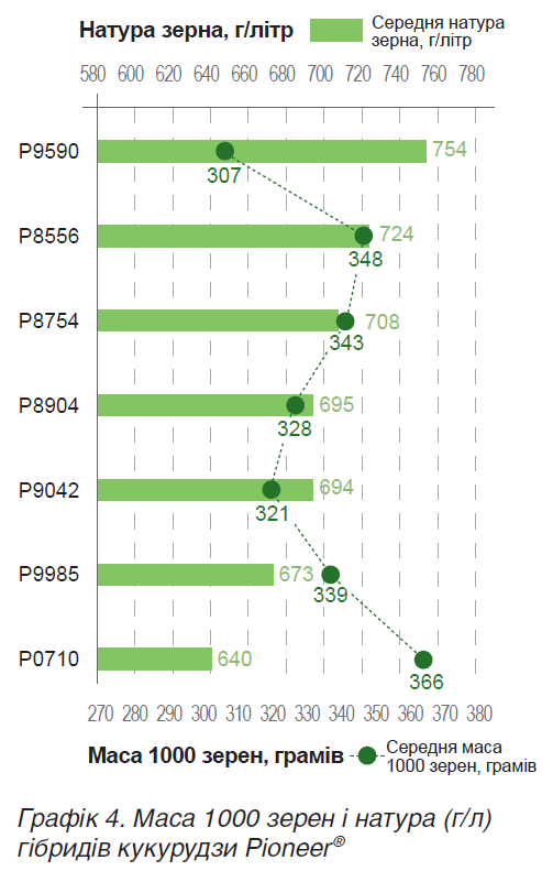 Кожен аграрій волів би мати гібриди з високою натурою зерна та доброю масою 1000 зерен. При сівбі стабільна маса 1000 зерен і добре відкаліброване насіння значно полегшують налаштування сівалки, сприяють оптимальному висіву та отриманню дружних сходів. При збиранні маса 1000 зерен є одним із ключових чинників гарного врожаю, а добра натура зерна зменшує втрати при транспортуванні, зберіганні, доробці. Графік 4 дає уявлення про показники натури та маси 1000 зерен нових гібридів Pioneer®. У всіх гібридів середні показники маси 1000 зерен перевищують 310 грамів (є партії з вищими показниками, що дає змогу обрати потрібні характеристики), а середня натура нових гібридів – 640 г/літр. Найвищу натуру має Р9590 з огляду на кременистий тип зерна та розмір і форму насінини. Оптимальний баланс притаманний Р8556, Р8754, Р8904, Р9042.