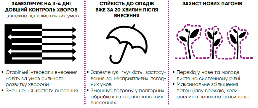 Двокомпонентний фунгіцид, що забезпечує неперевершену комбінацію стабільного та ефективного контролю мілдью винограду та хвороб томатів для отримання кращого врожаю навіть у складних умовах.