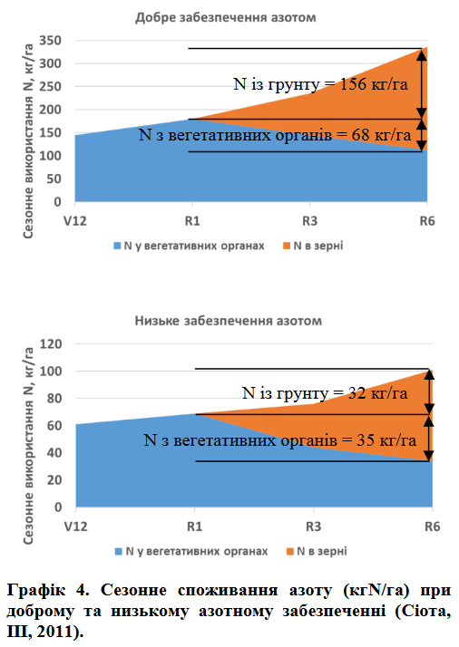 При низькому азотному живленні (урожайність на рівні 63 ц/га) споживання азоту на стадії R1 обмежувалося 69 кг/га і тільки 32 кг/га вбиралося із грунту після цвітіння (графік 4). Низьке забезпечення азотом імітує умови, коли доступний N обмежується вилуговуванням, денітрифікацієюта недостатнім його внесенням.