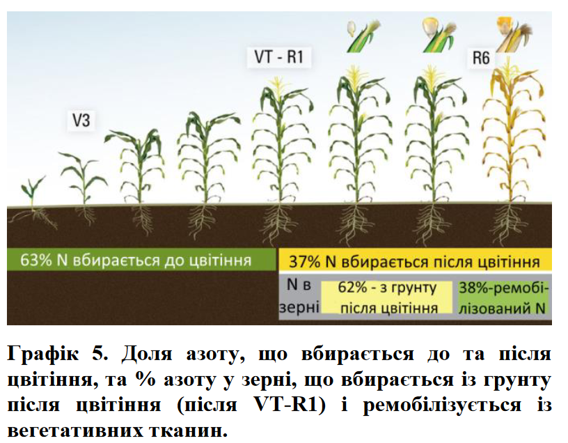– Азот для розвитку зернівок початку має два джерела: N, переміщений із вегетативних органів кукурудзи та N, який постійно вбирається із грунту. Таким чином, забезпечення азотомпротягом всього періоду вегетації кукурудзи є критичним для максимізації урожаю.