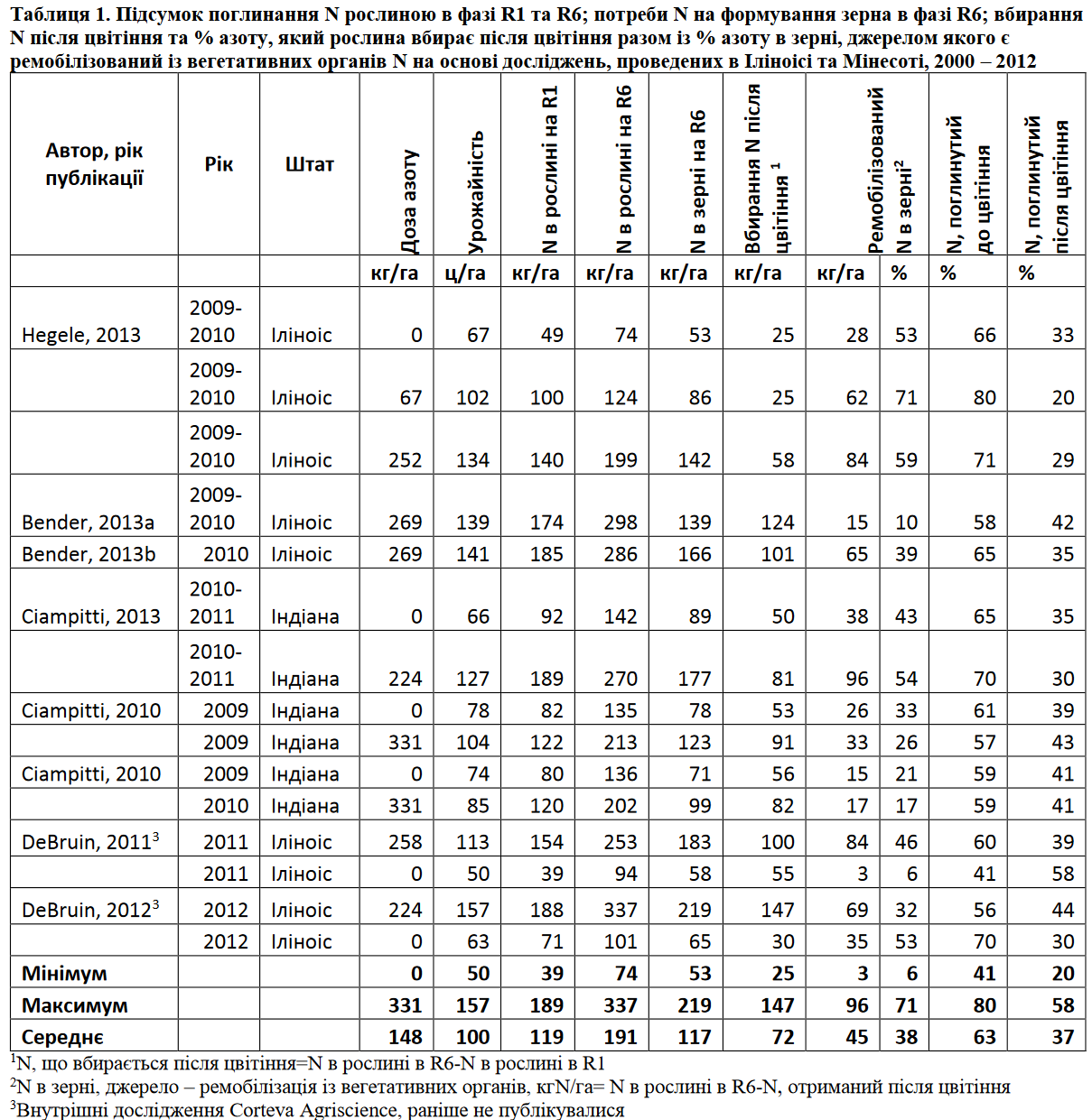 В умовах низького азотного живлення, коли вбирання N після цвітіння не може в повному обсязі забезпечити формування зерна, решта азоту ремобілізується із вегетативних органів (стебла, листя, обгортки, стрижень). Листя –основне джерело ремобілізованого азоту. Сучасні дослідження, проведені в Іліноісі та Індіані, показали, що в середньому доля ремобілізованого із вегетативних органів азоту складає 38%, а максимальне значення – 54% –має місце у сприятливих грунтово-кліматичних умовах із високим азотним живленням (таблиця 1). Незалежні дослідження ДеБруіна та інших (2012) зафіксували 63% як максимально можливий рівень ремобілізації азоту в зерно. Подальші дослідженнянауковців Cortevaдовели, що кількість ремобілізованогоіз стебел азоту складає близько 20%, а перерозподіл азоту із обгорток та стрижня в зерно є дуже незначним.