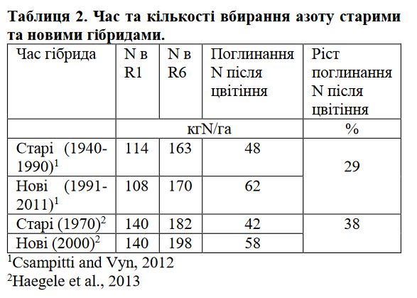 Haegele (2013) поглибив дослідження щодо часу вбирання азоту рослинами кукурудзи. Він порівняв гібриди із 1970-х років із гібридами, виведеними після 2000 року (таблиця 2). Згідно його досліджень, сучасні гібриди поглинали на 3.6 кг N більше протягом вегетаційного сезону і акумулювали на 40% більше азоту після цвітіння в порівнянні із старими гібридами (таблиця 2). Оцінка гібридів Pioneer, які продавалися у 1934 – 2013 роках дала аналогічні результати: сучасні гібриди поглинають більше азоту протягом вегетаційного періоду, а по часу, в порівнянні із старими гібридами, більша частина поглинається після цвітіння. Враховуючи наведені напрацювання, варто зробити переоцінку рекомендацій щодо часу внесення азоту та підтримки достатнього рівня азотного живлення протягом репродуктивних фаз розвитку кукурудзи.
