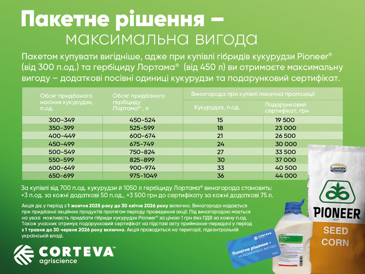 * За купівлі від 700 п.од. гібридів кукурудзи торгової марки Pioneer® й 1050 л гербіциду Лортама® винагорода складає: +3 п.од. за кожні додаткові 50 п.од., +3 500 грн до сертифікату за кожні додаткові 50 л. За купівлі від 251 п.од. гібридів соняшнику торгової марки Pioneer® й 601 л фунгіцилу Аканто Плюс® винагорода складає: +1 п.од. за кожні додаткові 20 п.од., +3 000 грн до сертифікату за кожні додаткові 50 л.