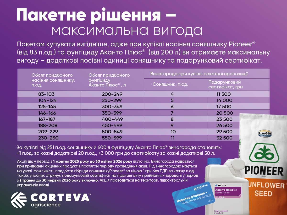 * За купівлі від 700 п.од. гібридів кукурудзи торгової марки Pioneer® й 1050 л гербіциду Лортама® винагорода складає: +3 п.од. за кожні додаткові 50 п.од., +3 500 грн до сертифікату за кожні додаткові 50 л. За купівлі від 251 п.од. гібридів соняшнику торгової марки Pioneer® й 600 л фунгіциду Аканто Плюс® винагорода складає: +1 п.од. за кожні додаткові 20 п.од., +3 000 грн до сертифікату за кожні додаткові 50 л.