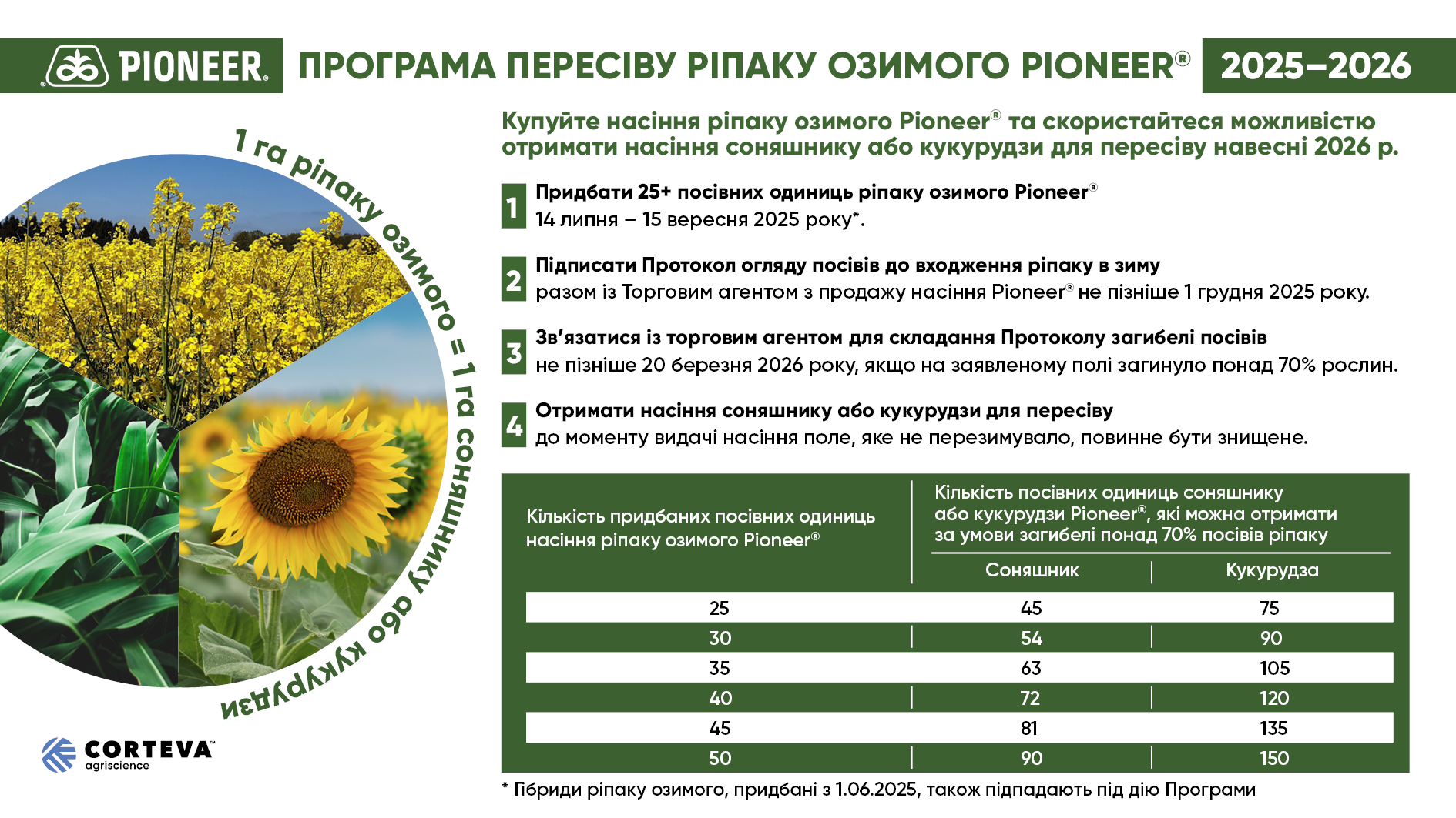 4.1 Учасник має право отримати за придбану Продукцію (насіння гібридів озимого ріпаку торгової марки Pioneer® в обсязі не менш ніж 25 посівних одиниць) Насіння для пересіву – насіння гібридів кукурудзи або соняшника Pioneer® для пересіву навесні 2026 р., якщо понад 70% посівів гібридів озимого ріпаку Pioneer®, придбаних Учасником, не перезимує. Насіння для пересіву відповідно до умов Програми передбачає продаж насіння гібридів кукурудзи або соняшника Pioneer® за 1,14 грн., включаючи ПДВ, із належним оформленням видаткової накладної, завіреної підписами та печатками з двох сторін із зазначенням посади та ПІБ підписантів.