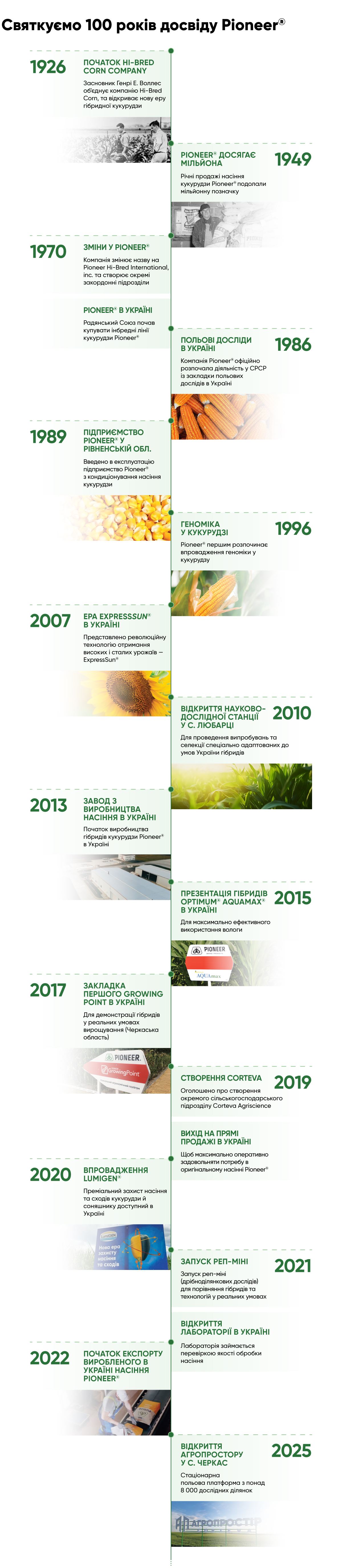 Від першої селекційної ділянки — до світової мережі дослідницьких центрів, від кукурудзи до бавовника Pioneer® завжди на крок попереду.