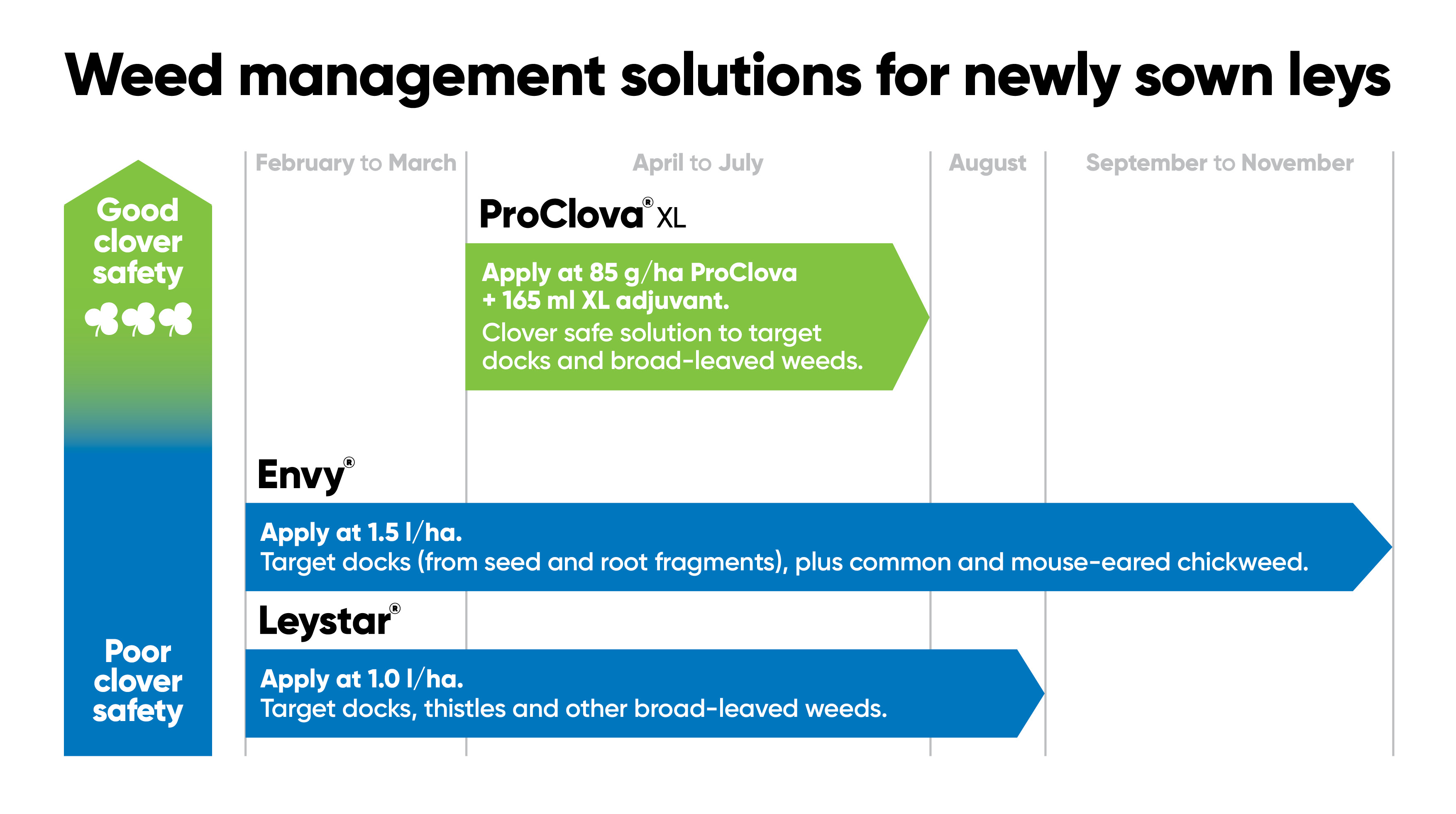 Leystar can be applied to new sown leys at 1.0 L/ha from 1st February to 31st August, and so is suitable for use on spring established new sown leys. Envy can be applied to new sown leys at 1.5 L/ha from 1st February to 30th November and so can be used on both autumn and spring established new sown leys.