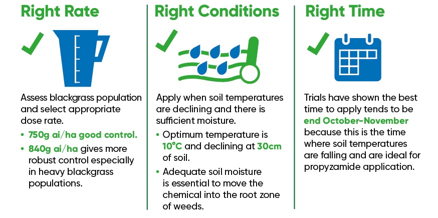 “Only use the maximum rate of 840gai/ha for severe blackgrass situations. A rate of 750gai/ha or 500gai/ha are recommended for less-severe blackgrass or other grasses and broad-leaved weeds. Only use one product containing propyzamide per crop per year.”