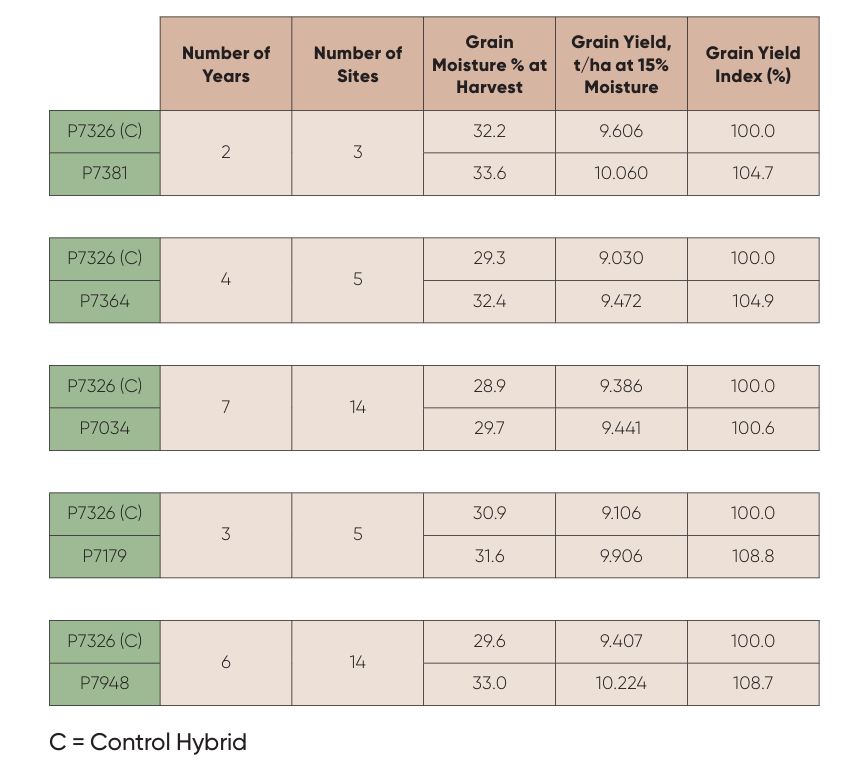PACTS grain trials have been conducted in the UK for many years. The number of test locations is increasing as the area increases. The performance of key Pioneer hybrids when harvested for grain can be seen in the multi-year chart below. Also shown are several key paired performance comparisons between selected hybrids.