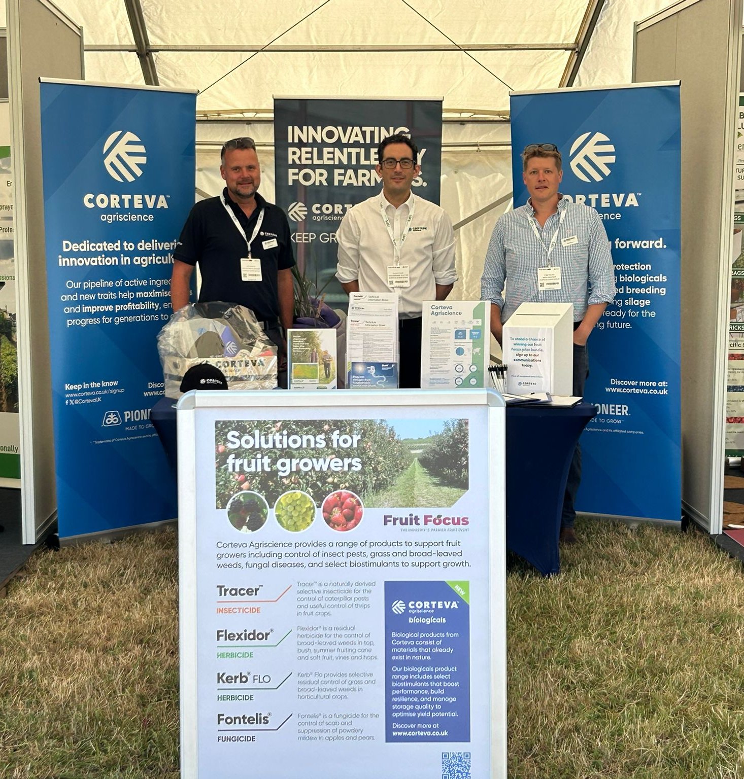 Pictured (left-to-right): Joe Martin (Field Technical Manager), Oliver Kent (National Business Manager - Speciality Crops) and Tom Rouse (Area Manager - East) at the 2025 Fruit Focus event in July.