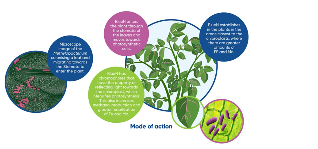 BlueN from Corteva Agriscience is an innovative biostimulant that enables plants to fix nitrogen from the air and make it available to the plant in the usable ammonium form. In doing so BlueN provides supplemental nitrogen to crops without the risk of leaching, increasing the crop nutrition efficiency.