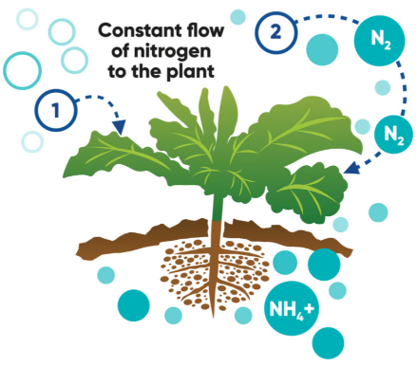 Utrisha N catalyses the conversion of nitrogen to ammonium inside the plant, providing the plant with a constant supply of nitrogen throughout the season.