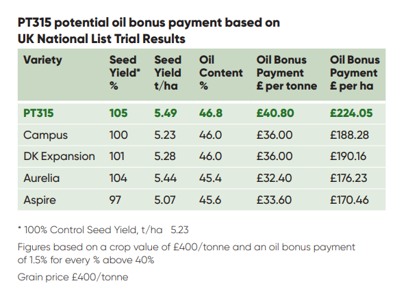PT315 has given one of the highest oil contents of any variety in both 2021 and 2022 UK National List Trials. This level of oil content is likely to generate significant oil bonus payments. An illustration of the type of oil bonus payments that may be achieved can be seen in the table below: