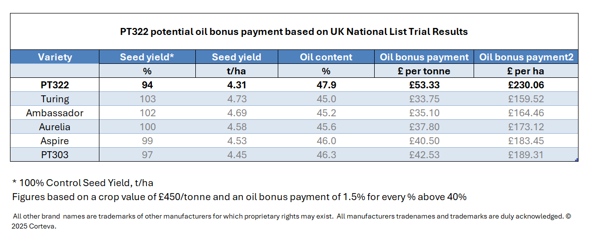 PT322 gave the highest oil content of any variety in 2023 and 2024 UK National List Trials. This level of oil content is likely to generate significant oil bonus payments. An illustration of the type of oil bonus payments that may be achieved can be seen in the table below.