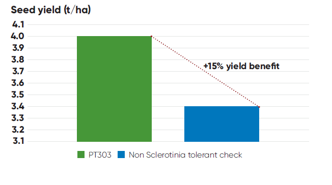 PT303 has a unique native multi-genic sclerotinia tolerance trait. By sowing PT303 growers can incorporate a level of tolerance to sclerotinia for the first time into their crop management planning.
