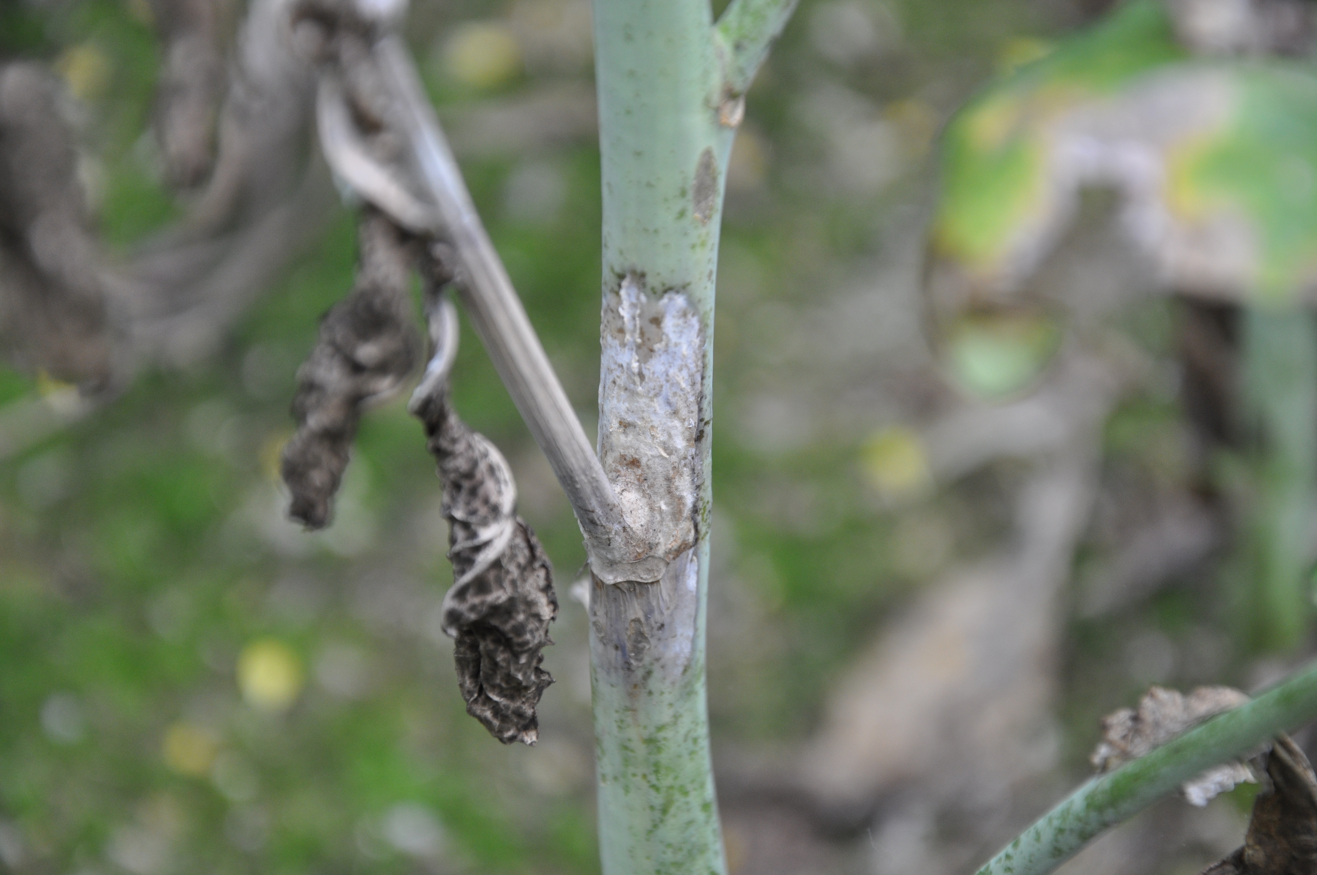 The infection starts as a watery, soft rot on the infected stems and leaves. Lesions will then appear, which can girdle the main stem, eventually resulting in plant wilting, lodging and the eventual death of the plant.