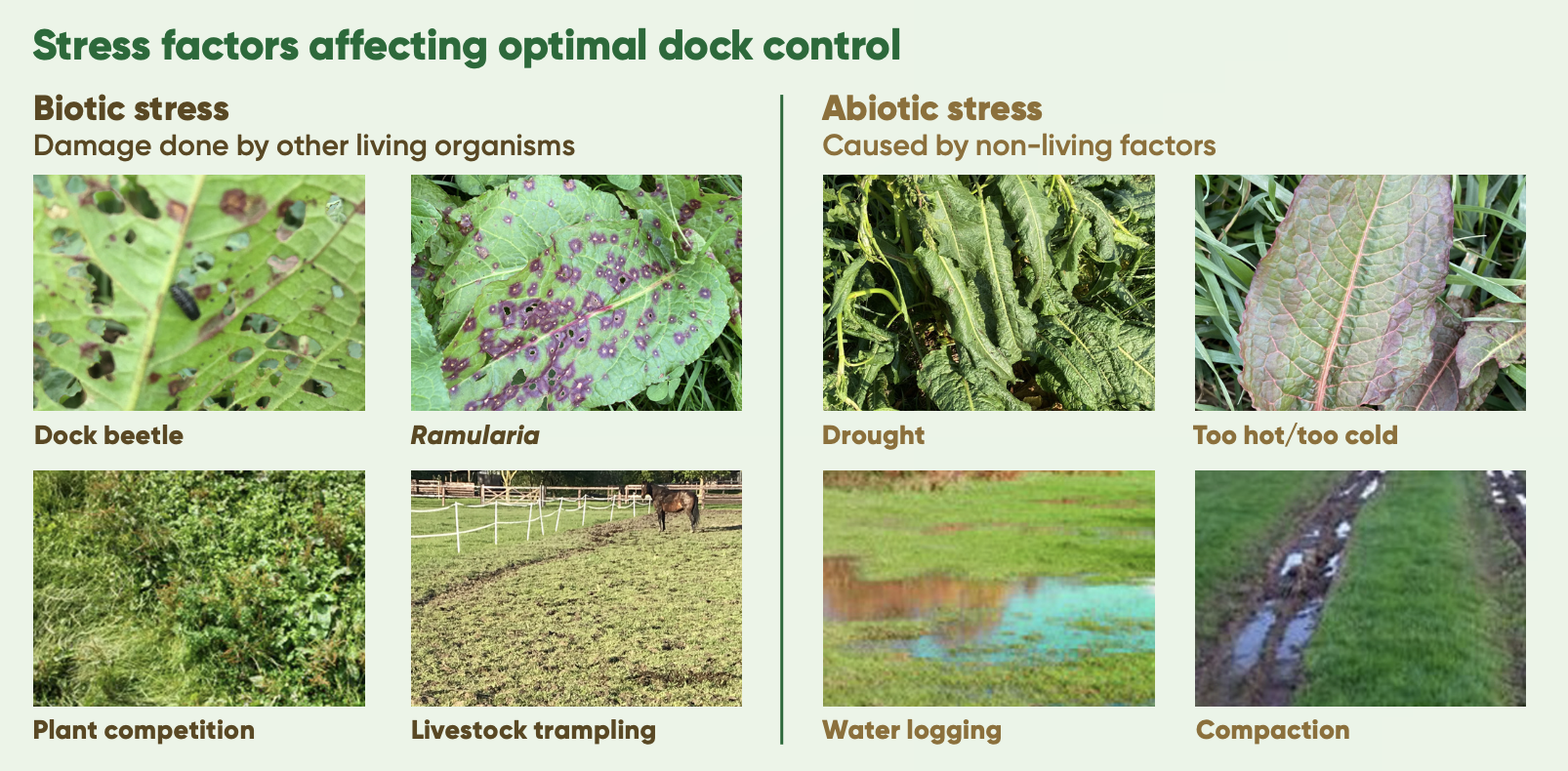 Topping and spraying dock re-growth once it reaches optimal size improves the levels of control if these factors are present.