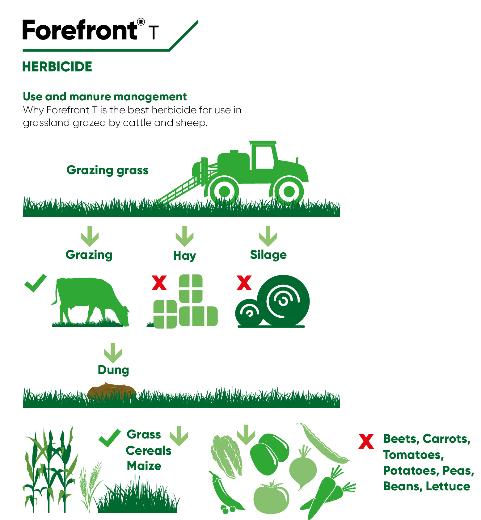 It must only be used on grass grazed by cattle and sheep as herbicide residues will carry over into grass fed fresh in a zero grazing system, or made into silage, hay or haylage. The resulting manure will affect sensitive crops if it used in their nutrition.