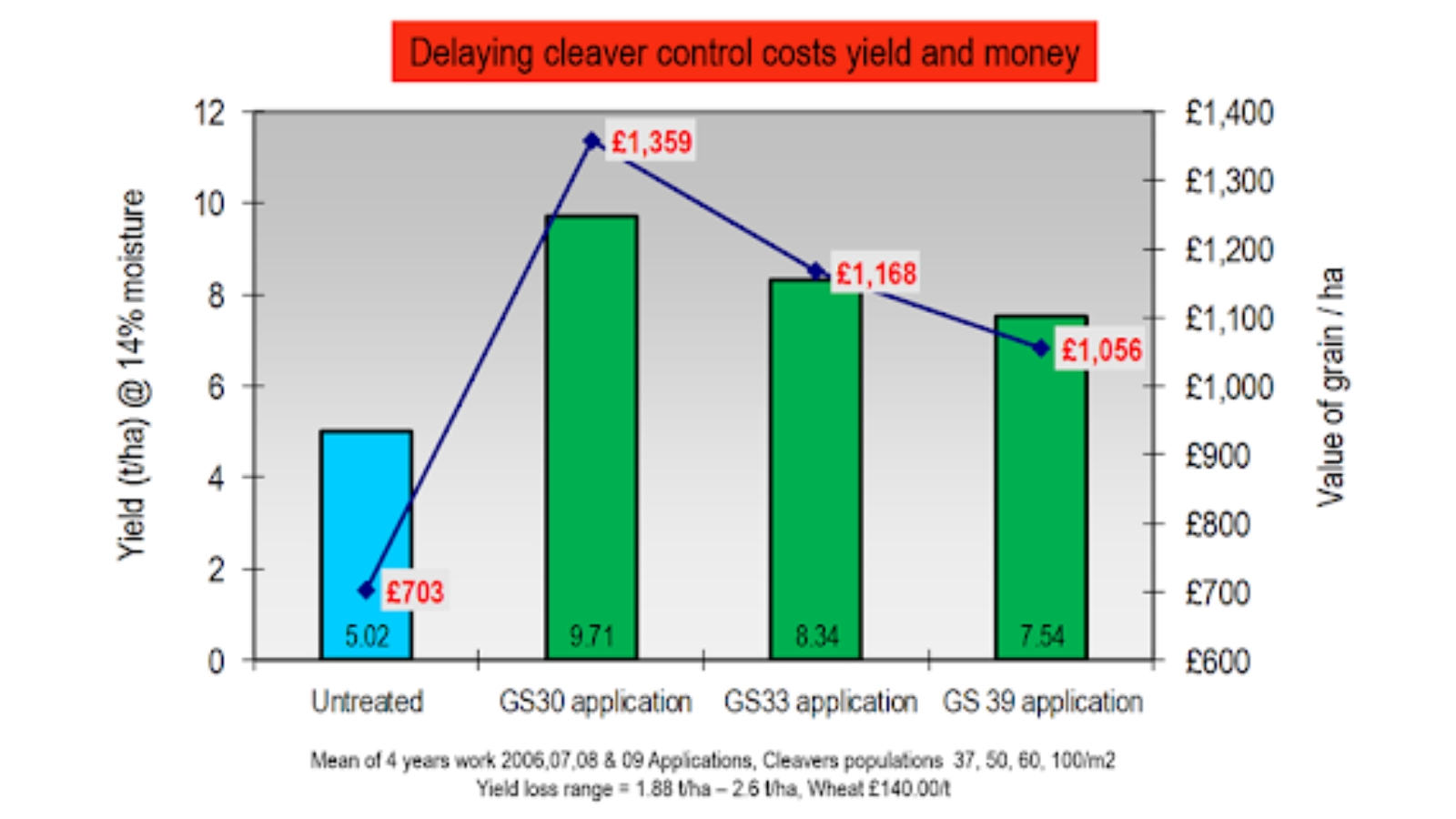 Extensive independent weed competition trials show cleavers compete with the crop from GS32 onwards.