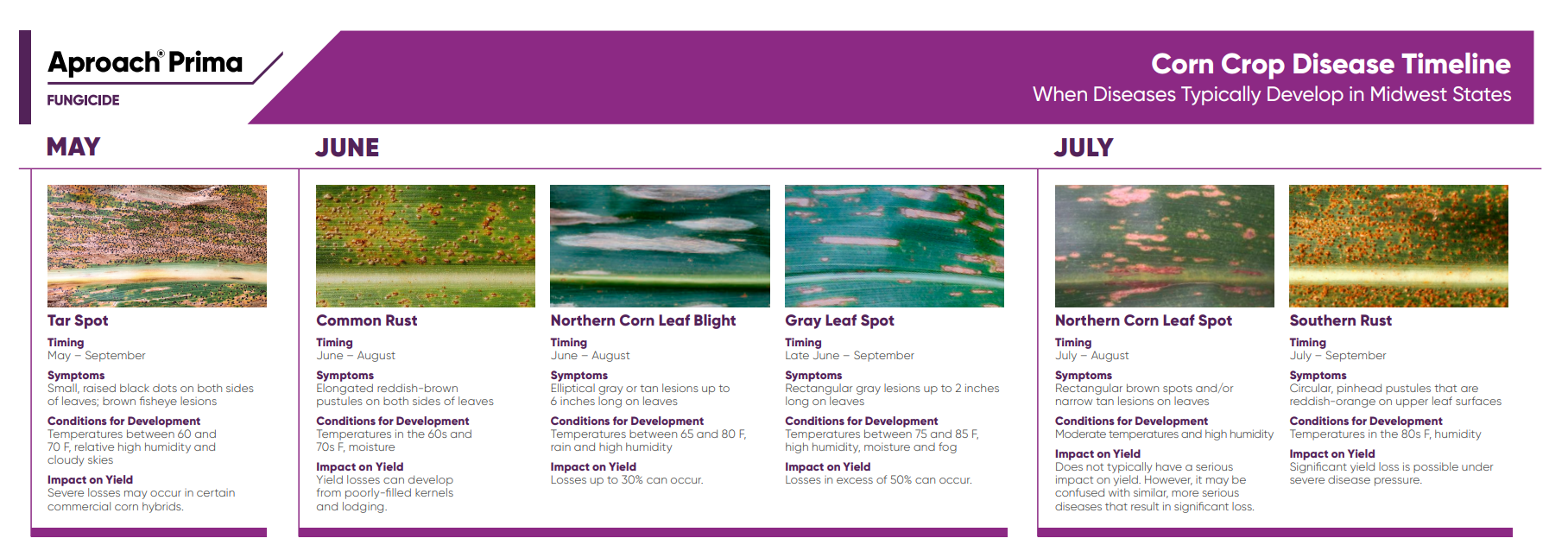 This timeline gives an overview of six common corn diseases, their symptoms, conditions for development and what months you might expect to find them while scouting. A couple of diseases to call out are northern corn leaf blight and tar spot.