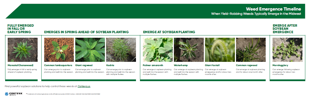 This weed emergence timeline features photos of nine herbicide-resistant species commonly found in Midwest soybean fields, when they’re likely to emerge and how long their emergence period typically lasts. Download the timeline for a handy reminder you can refer to in the field.