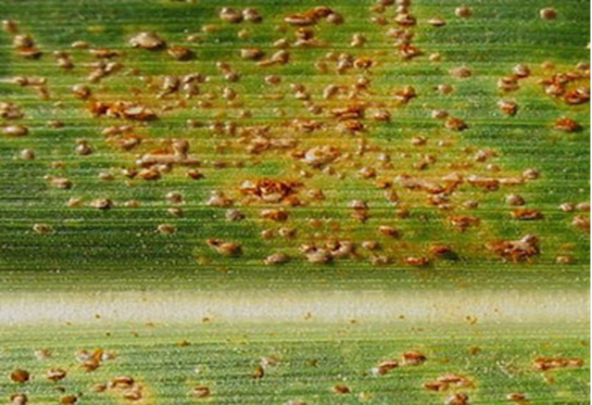 Symptoms: Lesions that begin as flecks on leaves and develop into small tan spots. Spots turn into elongated brick-red to cinnamon-brown pustules with a jagged appearance. Symptoms of common rust are found on both upper and lower leaf surfaces (unlike southern rust, where symptoms only appear on upper leaf surfaces).