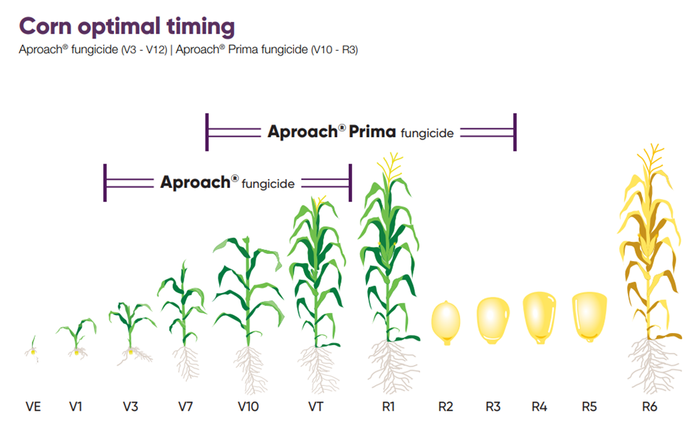 Aproach® and Aproach® Prima fungicides are two powerful choices to combat corn and soybean diseases. Both solutions are labeled for all the diseases listed above, with one exception: Aproach is labeled for control of white mold, while Aproach Prima is not. The following graphics show application guidelines for Aproach and Aproach Prima for corn and soybeans.