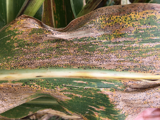 Symptoms: Black ovular or circular lesions on corn leaves that spread from the lower leaves to the upper leaves, leaf sheathes and eventually husks of developing corn ears.