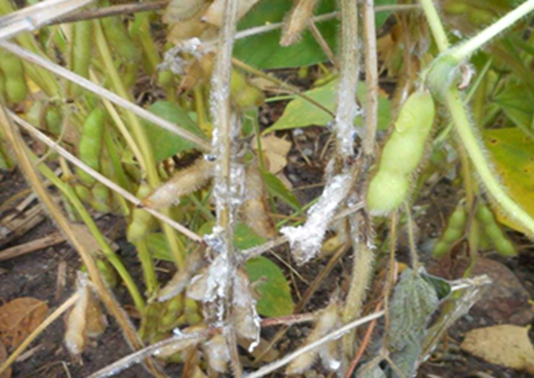 Symptoms: Infection signs are not immediately visible. The obvious signs may be apparent within three to four weeks of infection but generally go unnoticed for another week or more. Check stems of potentially infected plants to diagnose white mold. The first signs are gray to white lesions at nodes. Lesions rapidly spread above and below infected nodes and often are covered in fluffy, white growths.