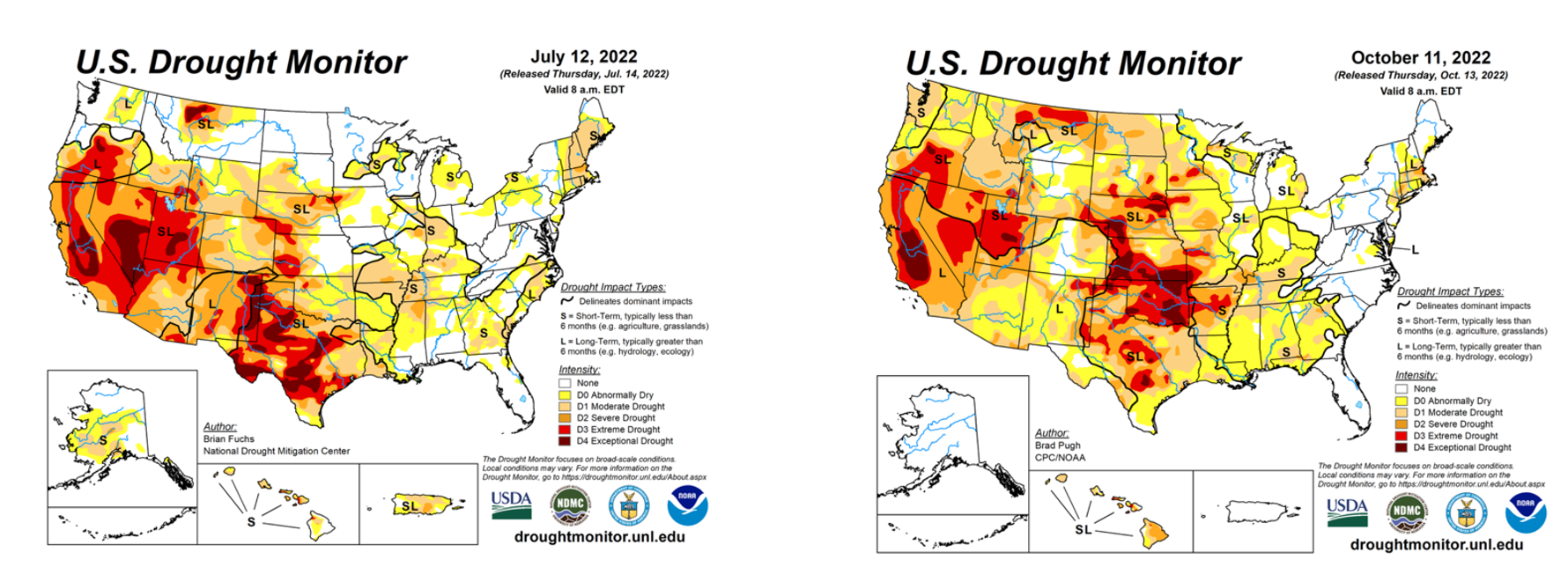 These two snapshots of drought severity (July and October) show the drought marching eastward toward the end of the growing season. The percentage of U.S. corn production area in drought was 17% in mid-June, 31% in early August and climbed to 71% in late October. “Yields would have been drastically reduced if that peak percentage happened in July,” Rippey says.