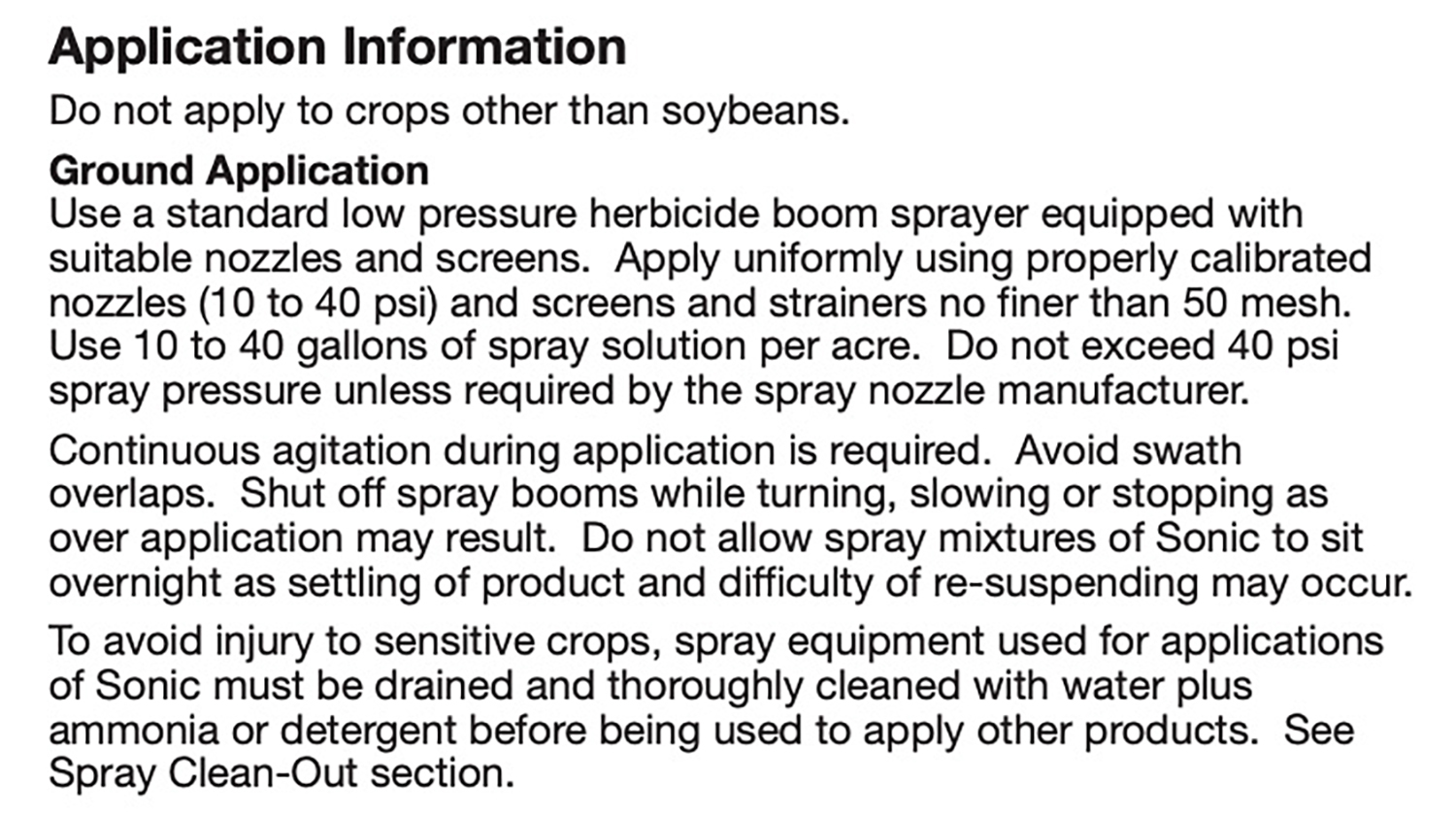 The label will also offer detailed instructions for sprayer prep, tank-mixing, sprayer cleanout and what types of adjuvants should be mixed with the herbicide. Part of the application section of the Sonic label is shown below.