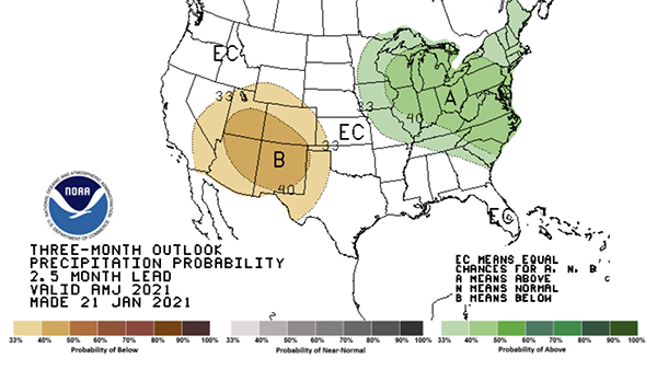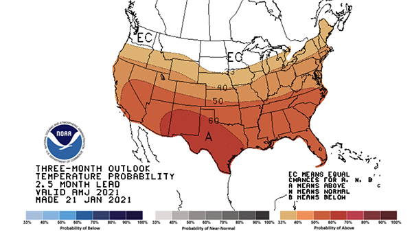 Anderson says the rest of winter and through the spring show above normal temperatures. The only chance for near- to below-normal temperatures is in the upper Corn Belt, north of Interstate 90. “This will allow fieldwork to proceed as drier soil warms up quicker. But it also starts up the whole vegetative cycle that begins to draw down available moisture,” he notes.