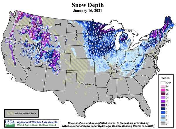 The winter snowpack currently isn’t set up to help the moisture situation. In the country’s prime row crop sector, precipitation is only 10% of normal over the past 60 days. And most of the region has been dry in the past 90 days. “Much of the upper Midwest—Minnesota, Wisconsin, Iowa—have had below-normal snowfall," he warns. "Down in Missouri toward the St. Louis area, they’ve had less than 5% of normal snow.”.