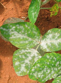 - Symptoms: Powdery gray or white patches appear on soybean plants. Symptoms are most obvious on upper leaf surfaces.