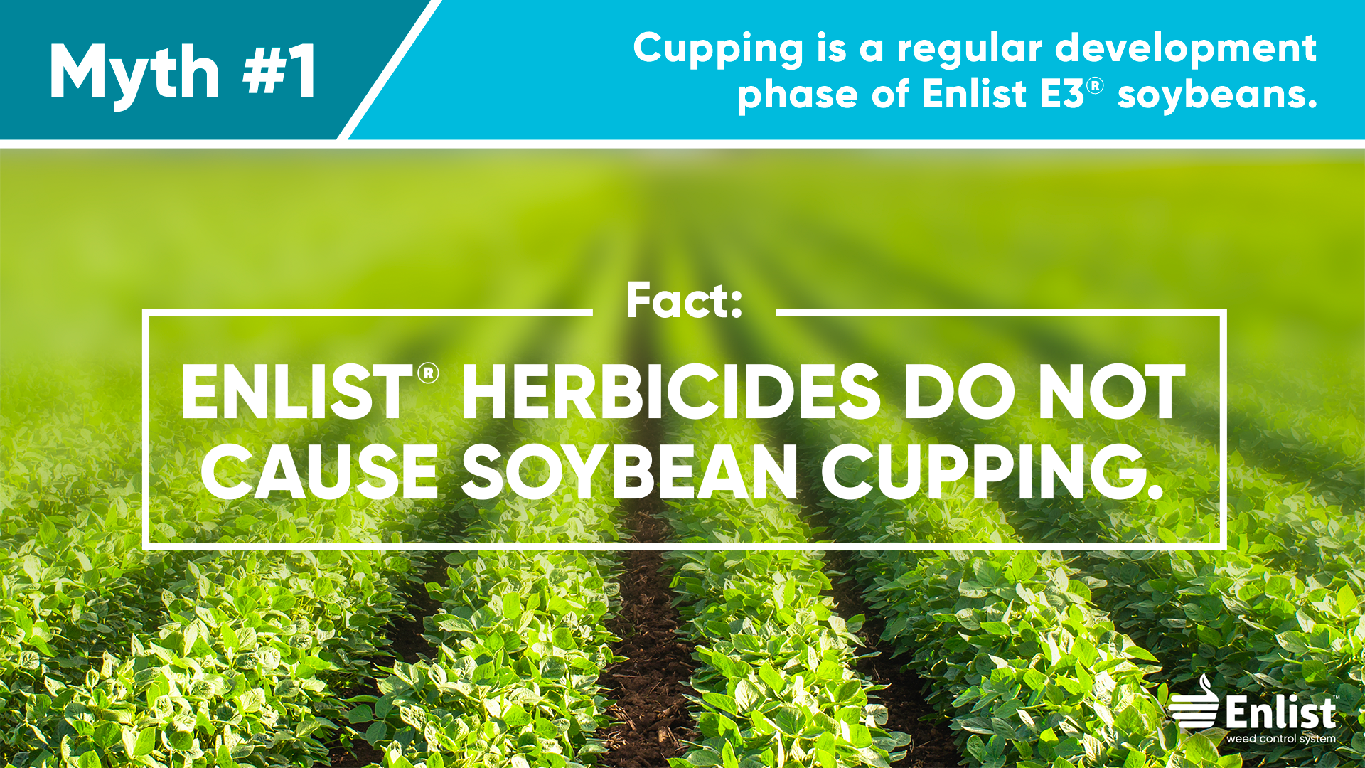 Soybean cupping is a crop injury caused by dicamba drifting onto Enlist E3® soybeans or other soybeans not tolerant to dicamba. Soybeans without the dicamba-tolerant trait may show symptomology from dicamba exposure at less than 1/800 of the standard spray rate, according to crop sensitivity research from University of Georgia.