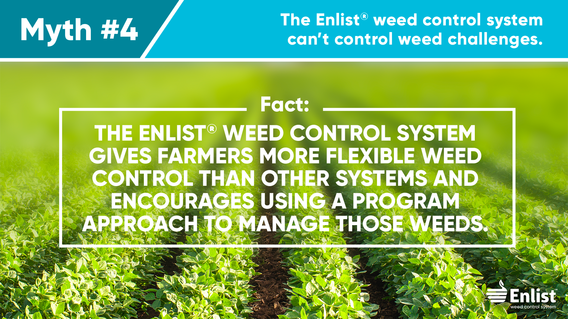 There are more than 1,700 qualified products — including herbicides, fungicides, insecticides and adjuvants — that farmers can tank-mix with Enlist One herbicide and applied over the top of soybeans, cotton and corn with the Enlist® trait for broad-spectrum weed control. Enlist herbicides also can be applied as preemergence and in burndown — with no plant-back restrictions for Enlist® crops.