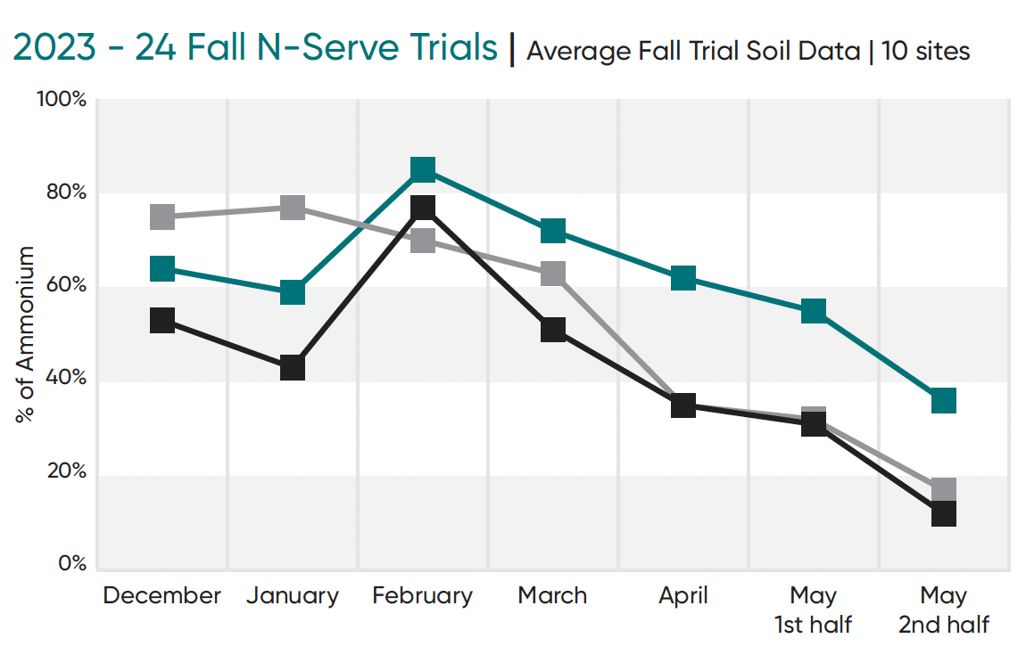 In 6 months with higher-than-average rainfall across 10 trial locations, N-Serve nitrogen stabilizer maintained a higher amount of nitrogen in the ammonium form compared with competitors in similar conditions. See the data summary below, and download a copy of the full fact sheet here.