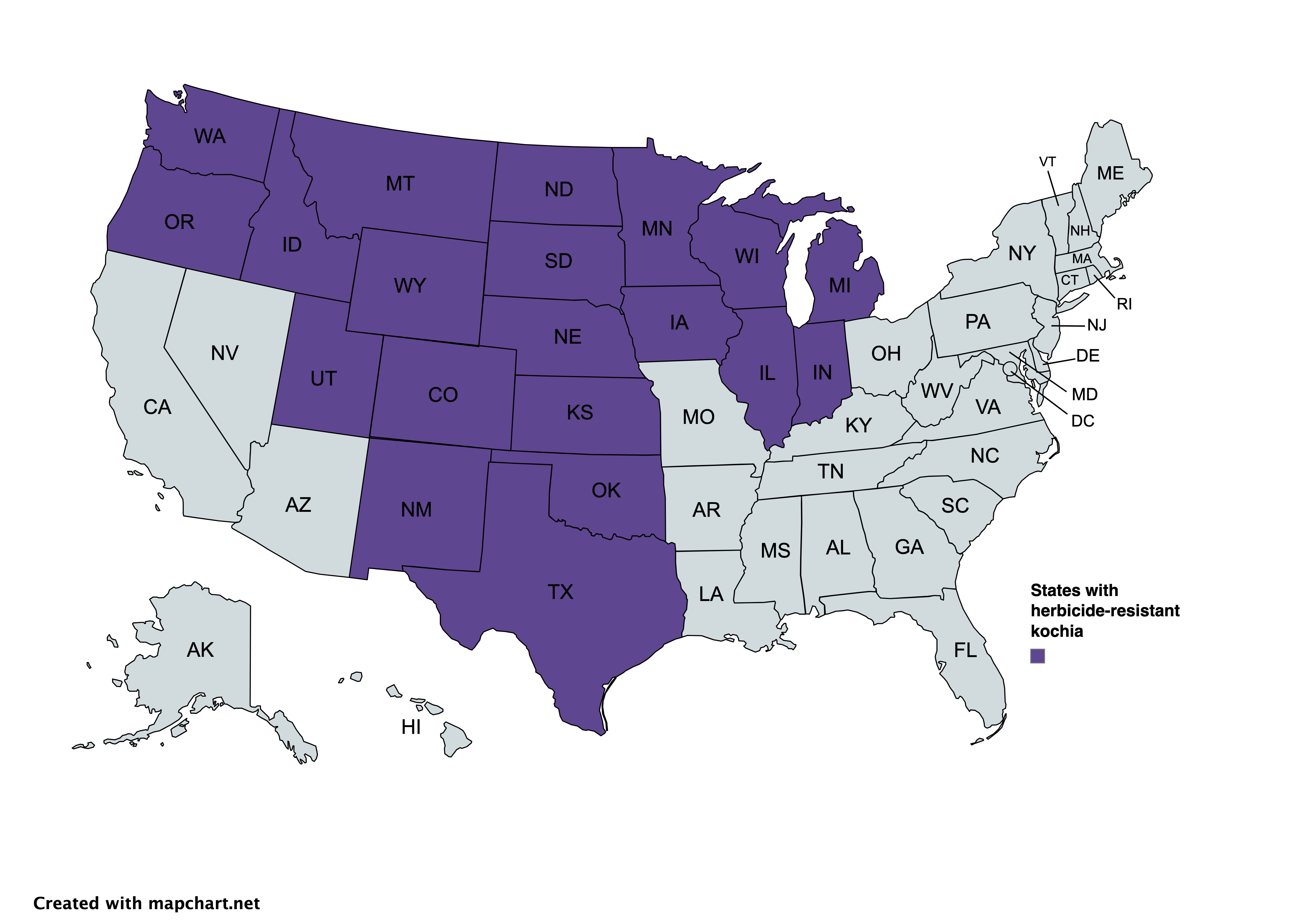 According to the International Herbicide-resistant Weed Database, herbicide-resistant kochia has been found in 20 states. In addition, the weed has shown resistance to herbicide in noncrop areas like railways, roadsides, and industrial sites in Indiana, Idaho, Iowa, Kansas, New Mexico and Utah.
