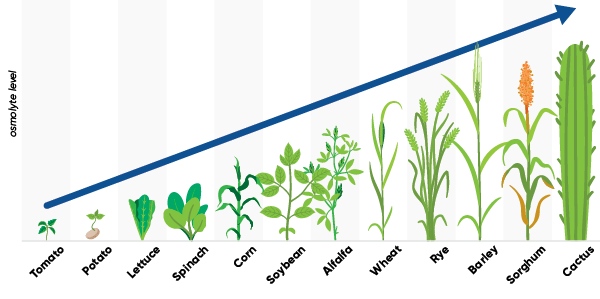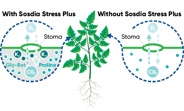 The application of Sosdia Stress Plus, with key components of proline and betaine , helps specialty crops react more similarly to crops with higher levels of osmolytes. Osmolytes are a natural compound found within plants that helps neutralize crop reaction to abiotic stress.