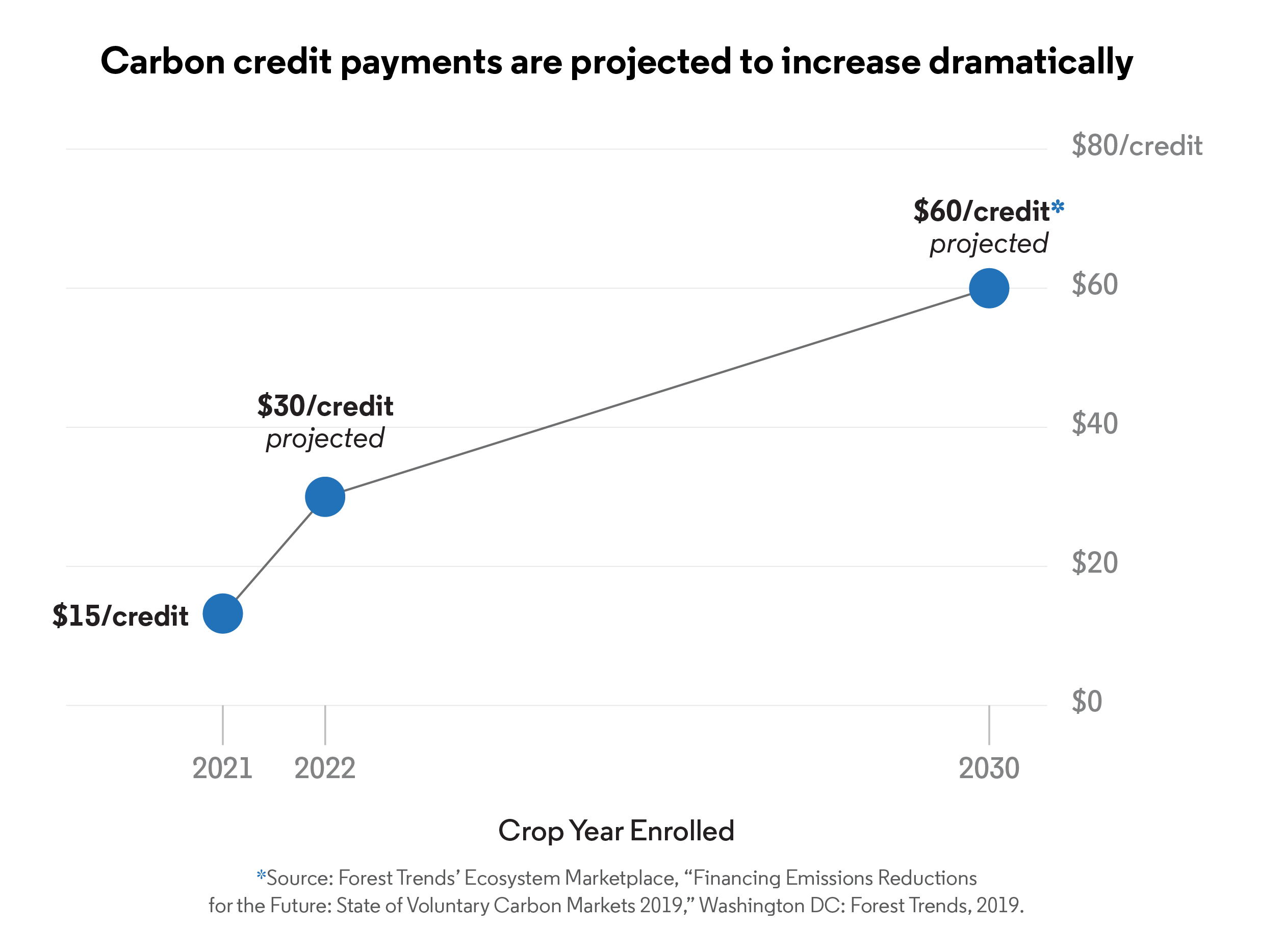 *Carbon credit prices have already increased 35% year over year across Indigo's buyer networks. Indigo projects farmers to receive $30/credit subject to market development.