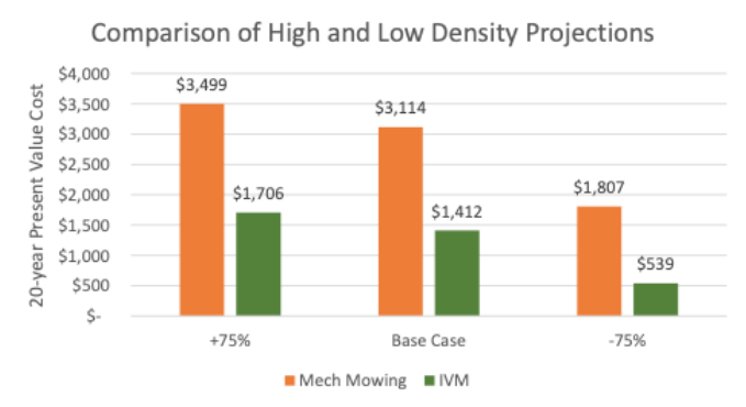 As stem height and density directly impact the cost of vegetation management on utility rights-of-way, improved results achieved through the use of herbicides allows IVM programs to cost significantly less than programs in which mechanized mowing is used exclusively. This includes scenarios in which efficacy levels fall above or below expected results.