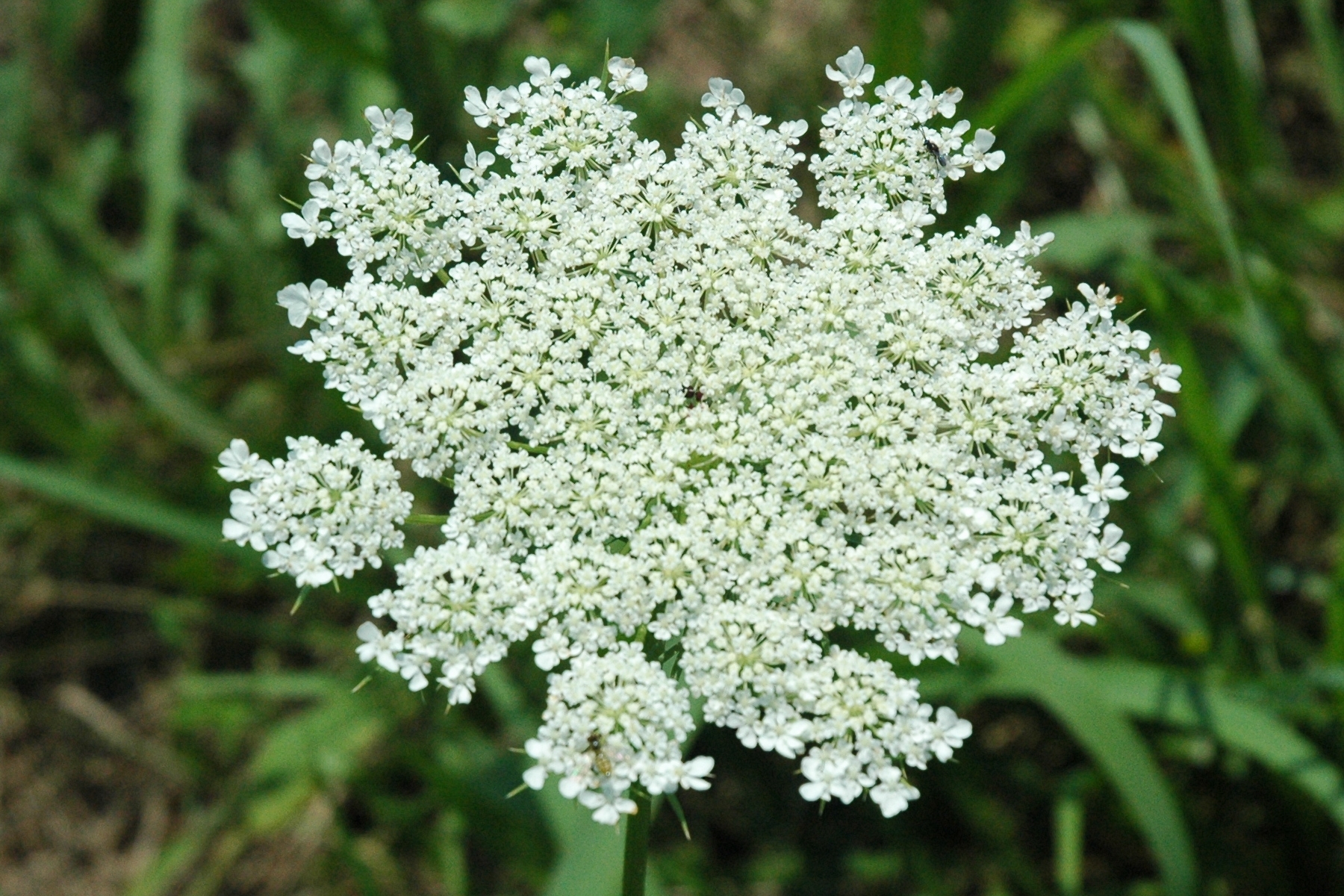 Wild carrot — often called Queen Anne’s Lace — is commonly known for its tiny and white flowers, clustered in flat, dense 2- to 4-inch umbels, often with one dark flower in the center. Before the plant matures, growing up to 4 feet tall, it starts as a rosette, not flowering for the first year.