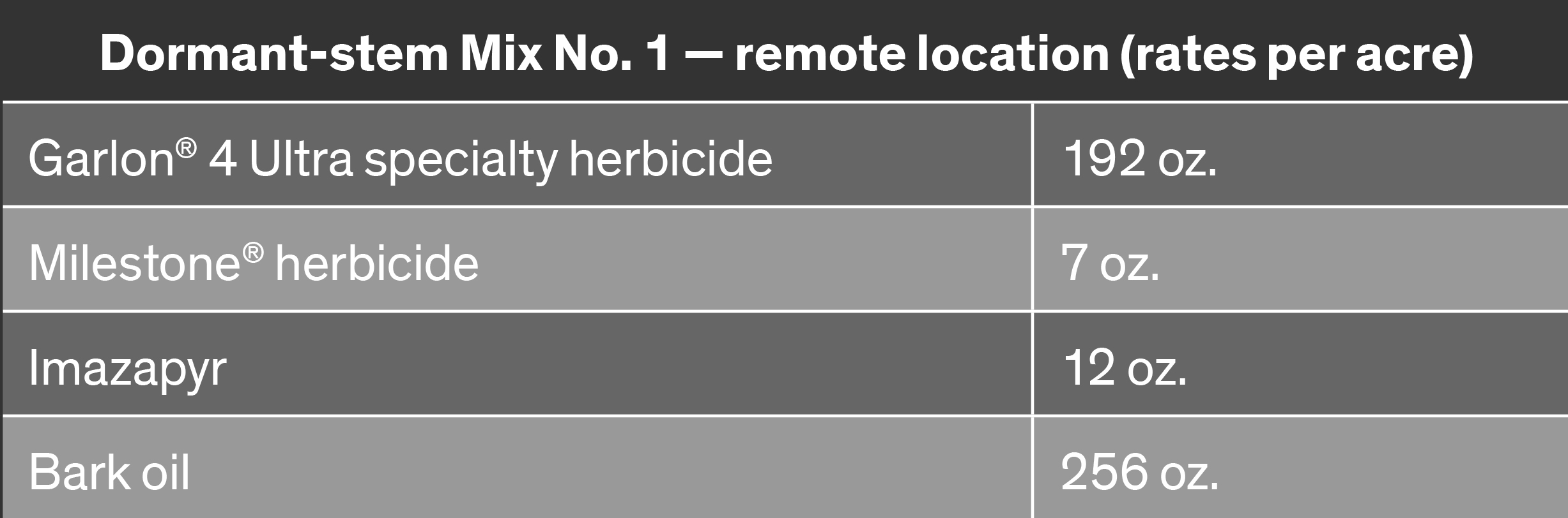 Each location had its own herbicide mix. The remote right-of-way mix was Garlon® 4 Ultra specialty herbicide, Milestone® herbicide, imazapyr and bark oil. The more visible location added Tordon® 22K specialty herbicide but lowered the rate of imazapyr. The team applied both mixes by using hydraulic sprayers. Exact rates are listed in the charts below: